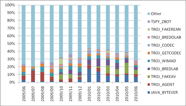 2010年6月1日から2010年6月30日の期間に収集した送信ログにおけるOS の分布を図 10に示します。Windows XP SP3 が6割強、Windows Vista SP2が2割弱とどちらのOSにおいても最新のSPが適用されている送信ログが多く見られています。しかし依然 としてWindows XPではSP0からSP2の送信ログが1割弱確認されており、Windows Updateが実施されていない環境も引き続き多く存在しています。